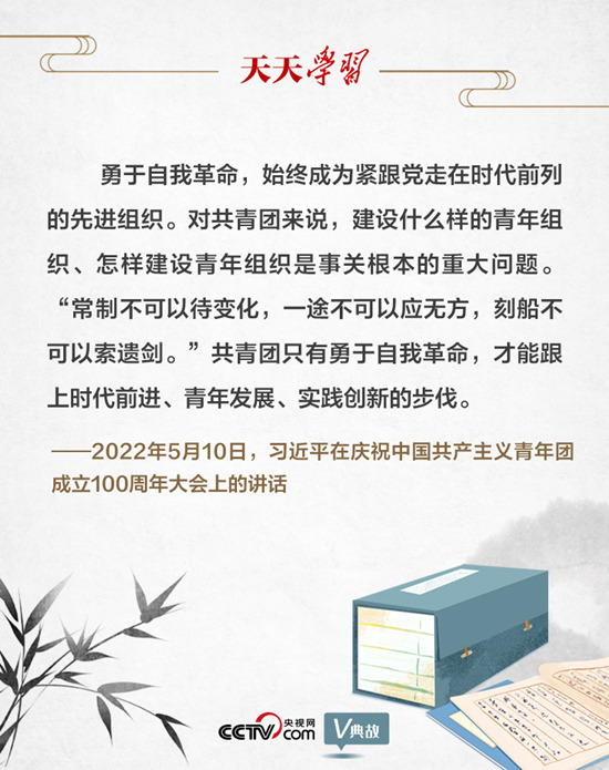 在慶祝中國共產主義青年團成立100周年大會上,習近平總書記強調:“勇于自我革命,始終成為緊跟黨走在時代前列的先進組織。對共青團來說,建設什么樣的青年組織、怎樣建設青年組織是事關根本的重大問題。”他要求新時代共青團勇于自我革命,跟上時代前進、青年發展、實踐創新的步伐。